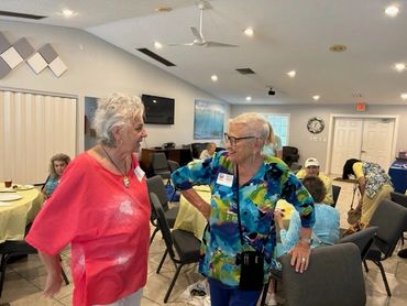 Bishop Bridget Mary Meehan, a Sarasota resident and pioneer in the Association of Roman Catholic Women Priests, discusses her recent trip to the Vatican with Tom Matrullo at WIN’s November 2024 program at the Oakhurst Clubhouse.